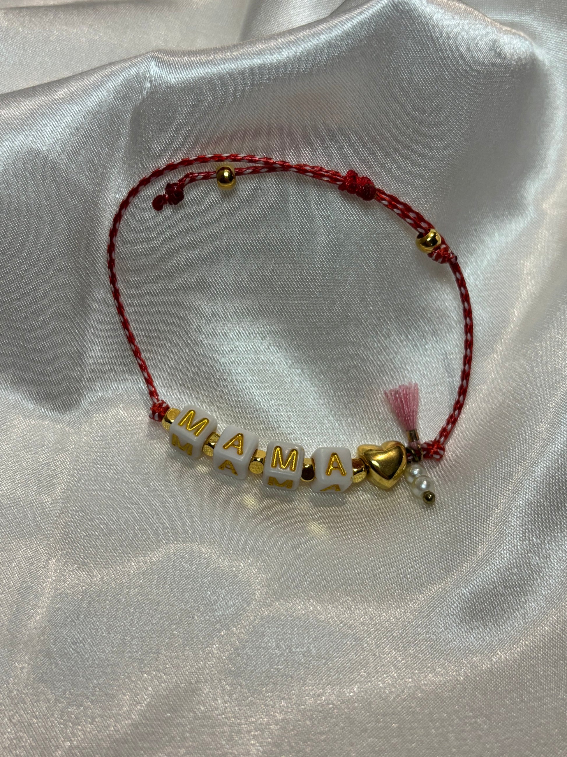 Μαρτάκι με διασκοσμητικό στοιχείο "Μαμά" ,ατσάλινη χρυσή καρδούλα και ροζ φουντίτσα.