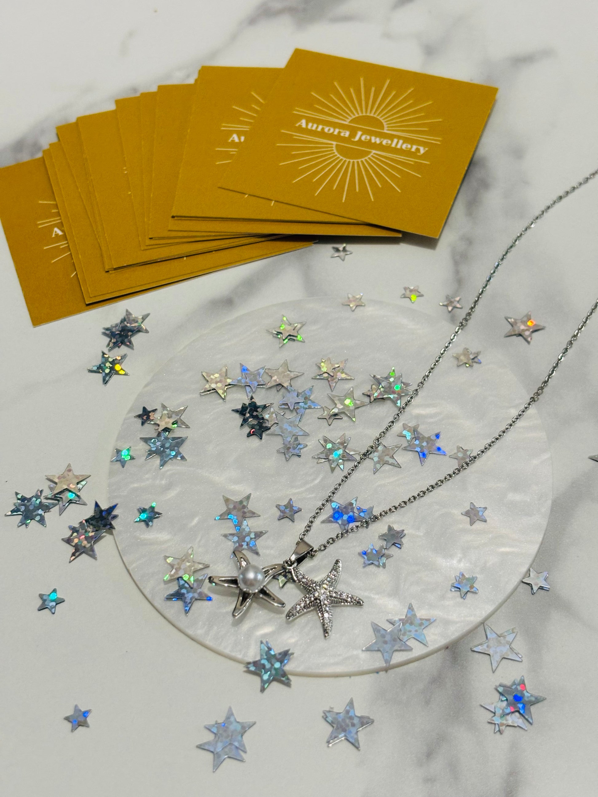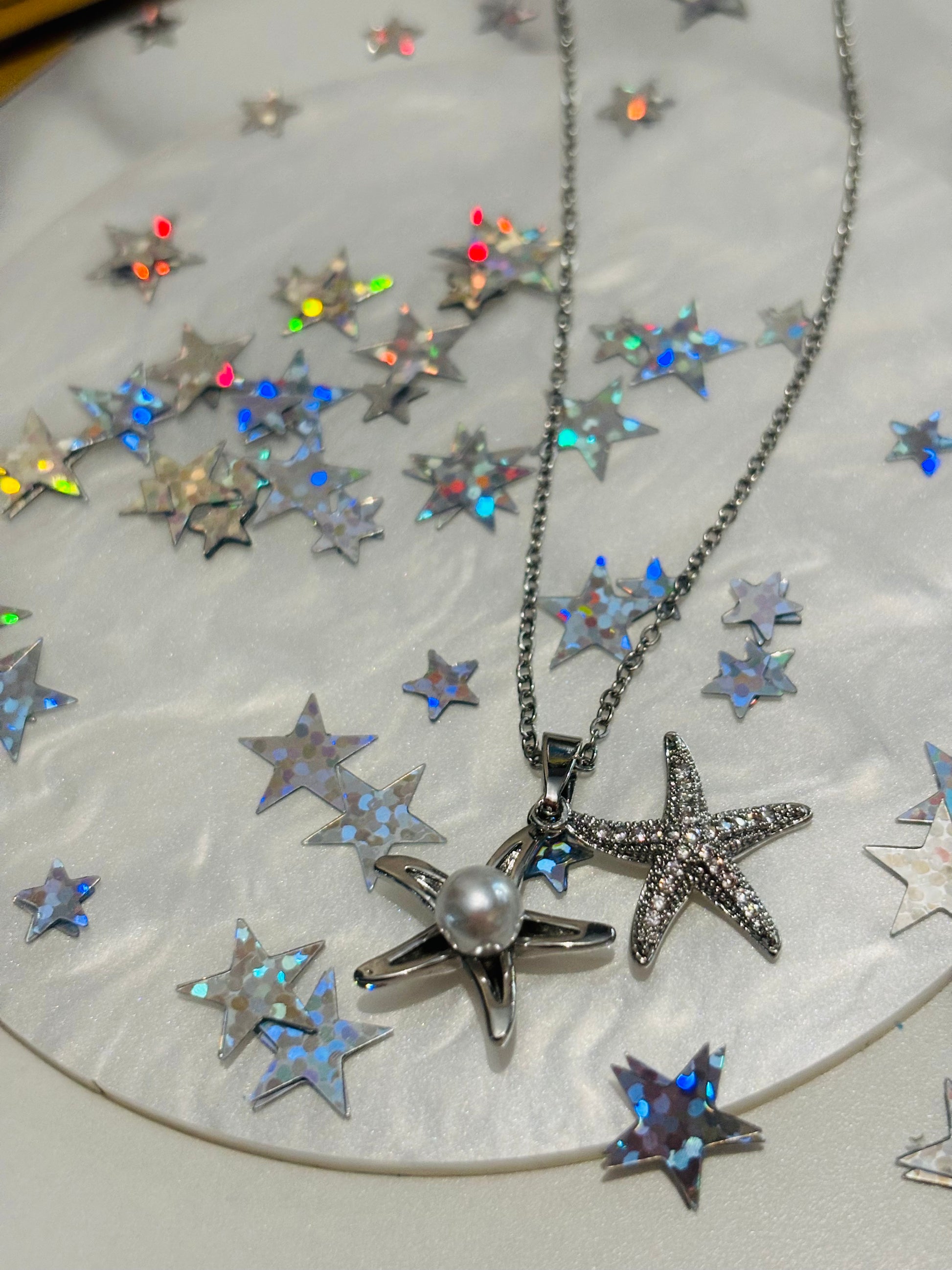 Ατσάλινη αλυσίδα με διπλό αστερία με ζιργκόν και πέρλα.