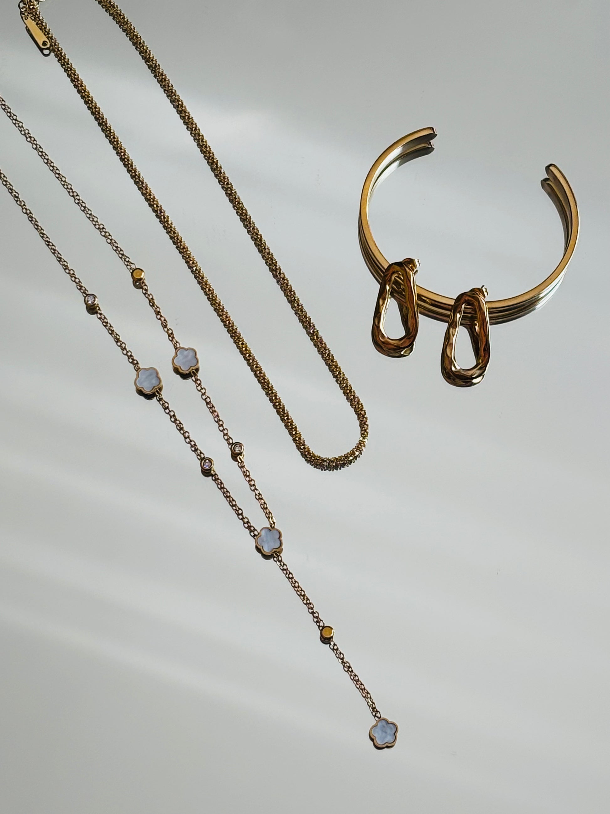 Σετ αποτελούμενο από κολιέ σε στυλ γραβάτα, αλυσίδα που έρχεται πιο κοντά στο λαιμό, σκουλαρίκια και χειροπέδα σε μίνιμαλ γραμμή.