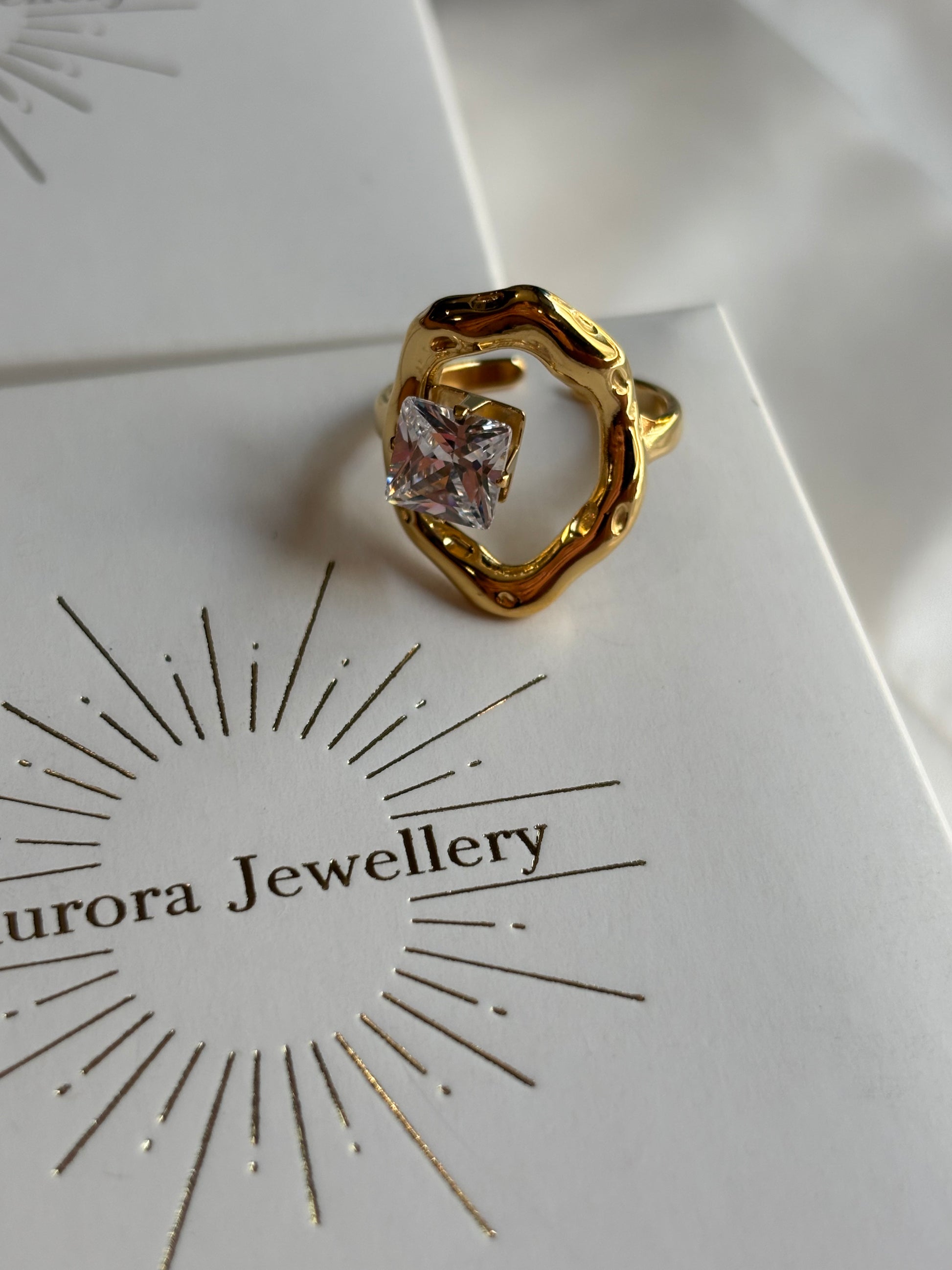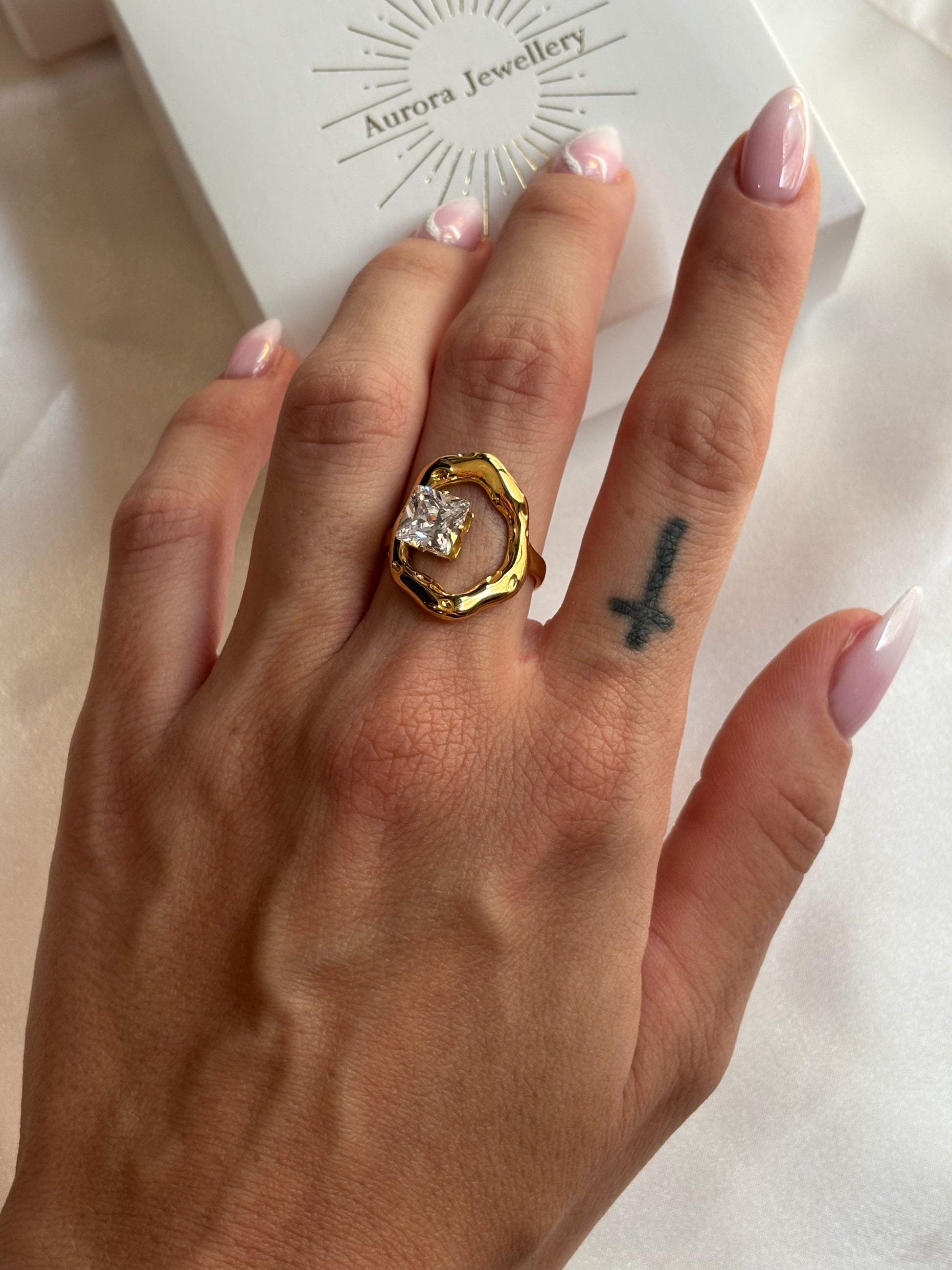 Ιδιαίτερο δαχτυλίδι με κύκλο σε ακανόνιστο σχήμα και μεγάλο ζιργκόν.