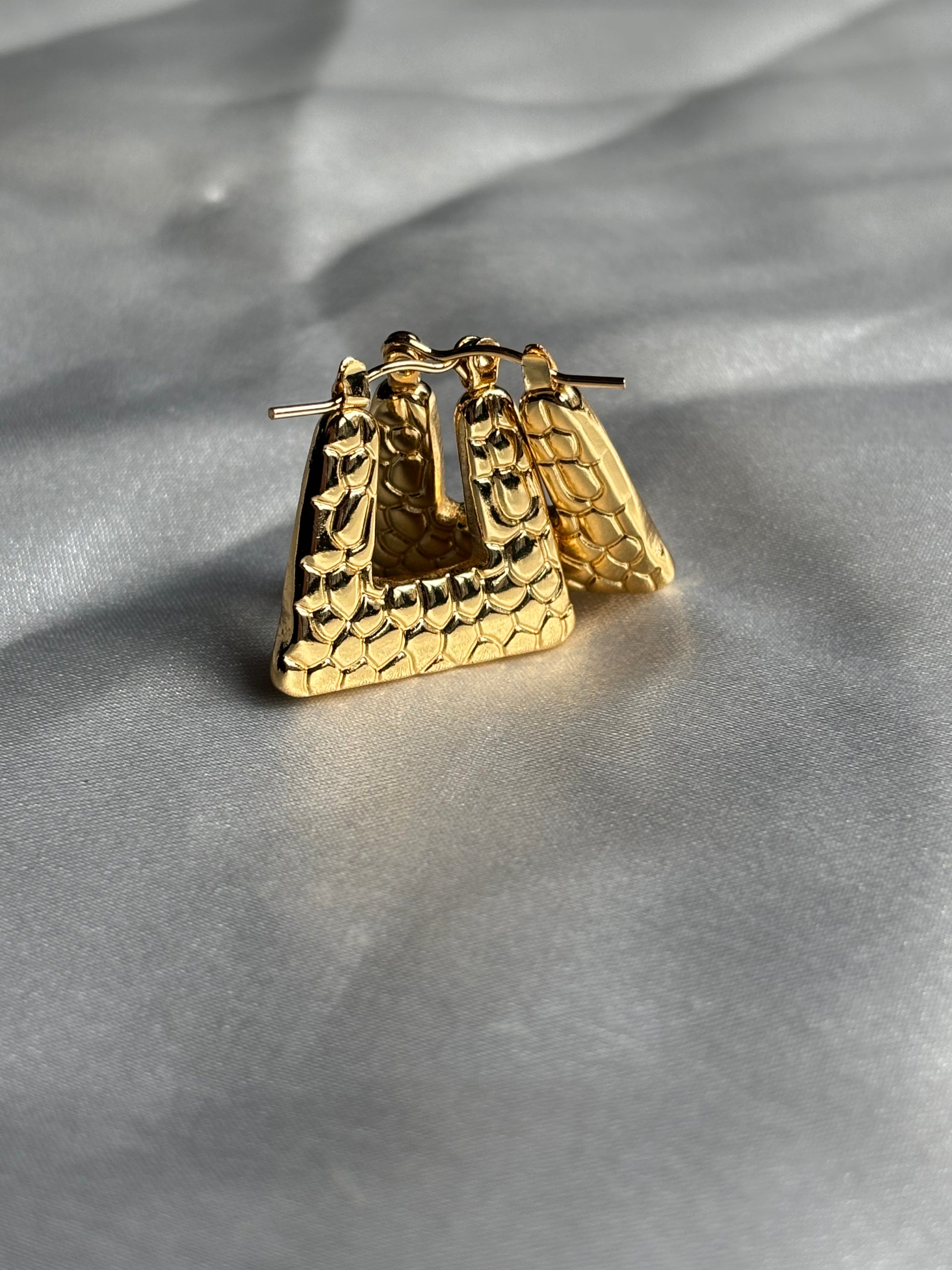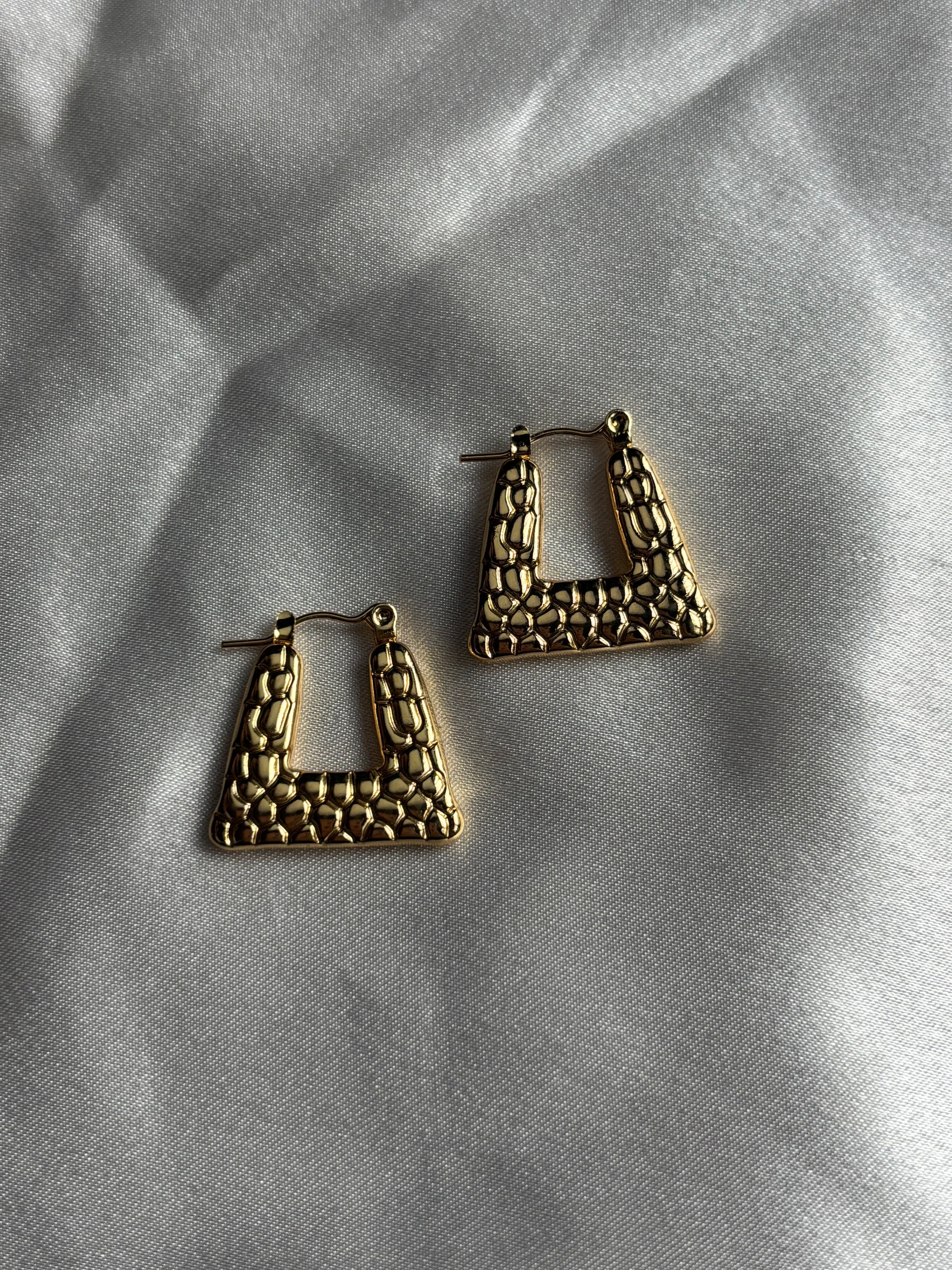 Χρυσά σκουλαρίκια σε ιδιαίτερο σχήμα και με ανάγλυφη υφή.