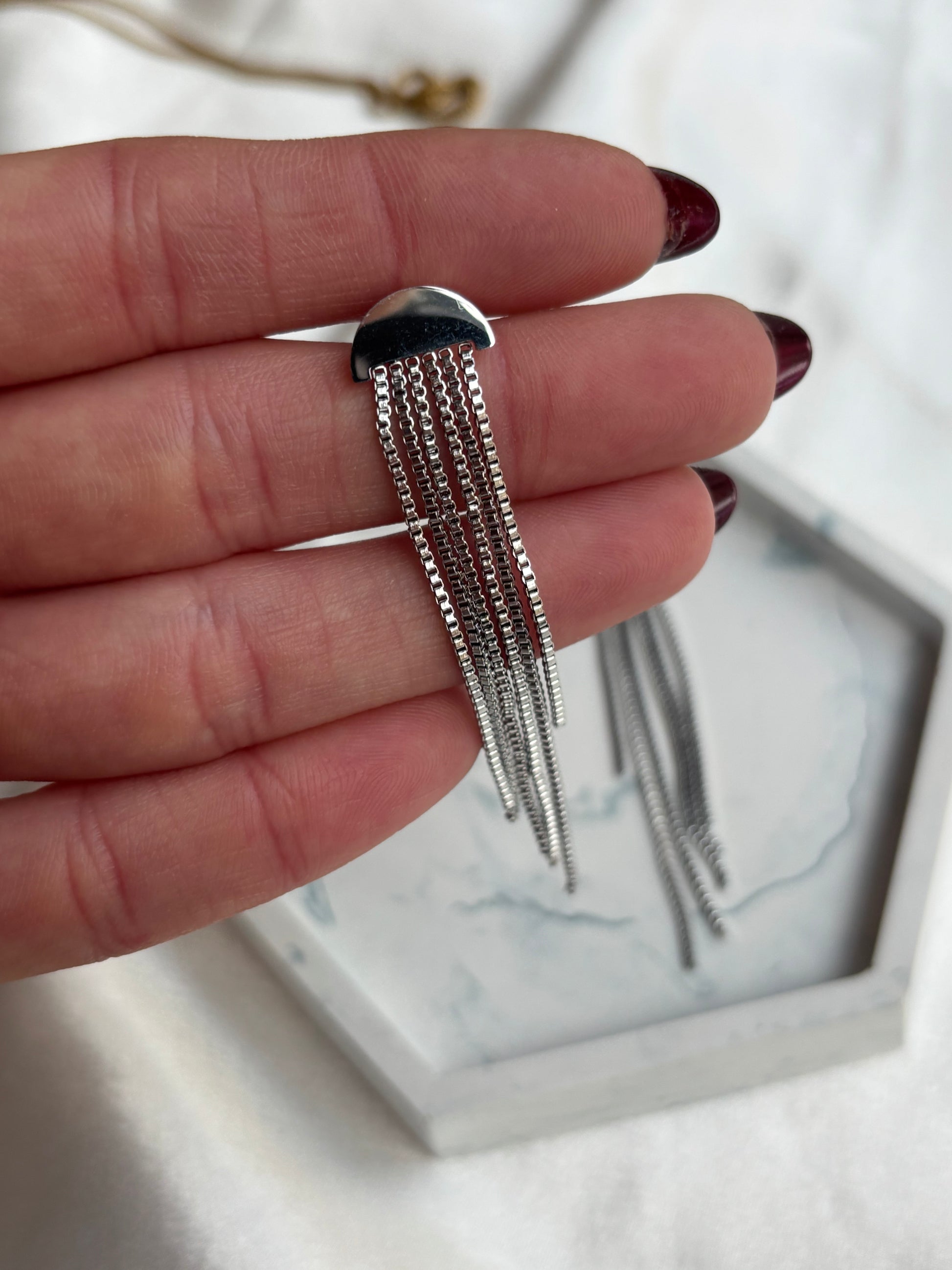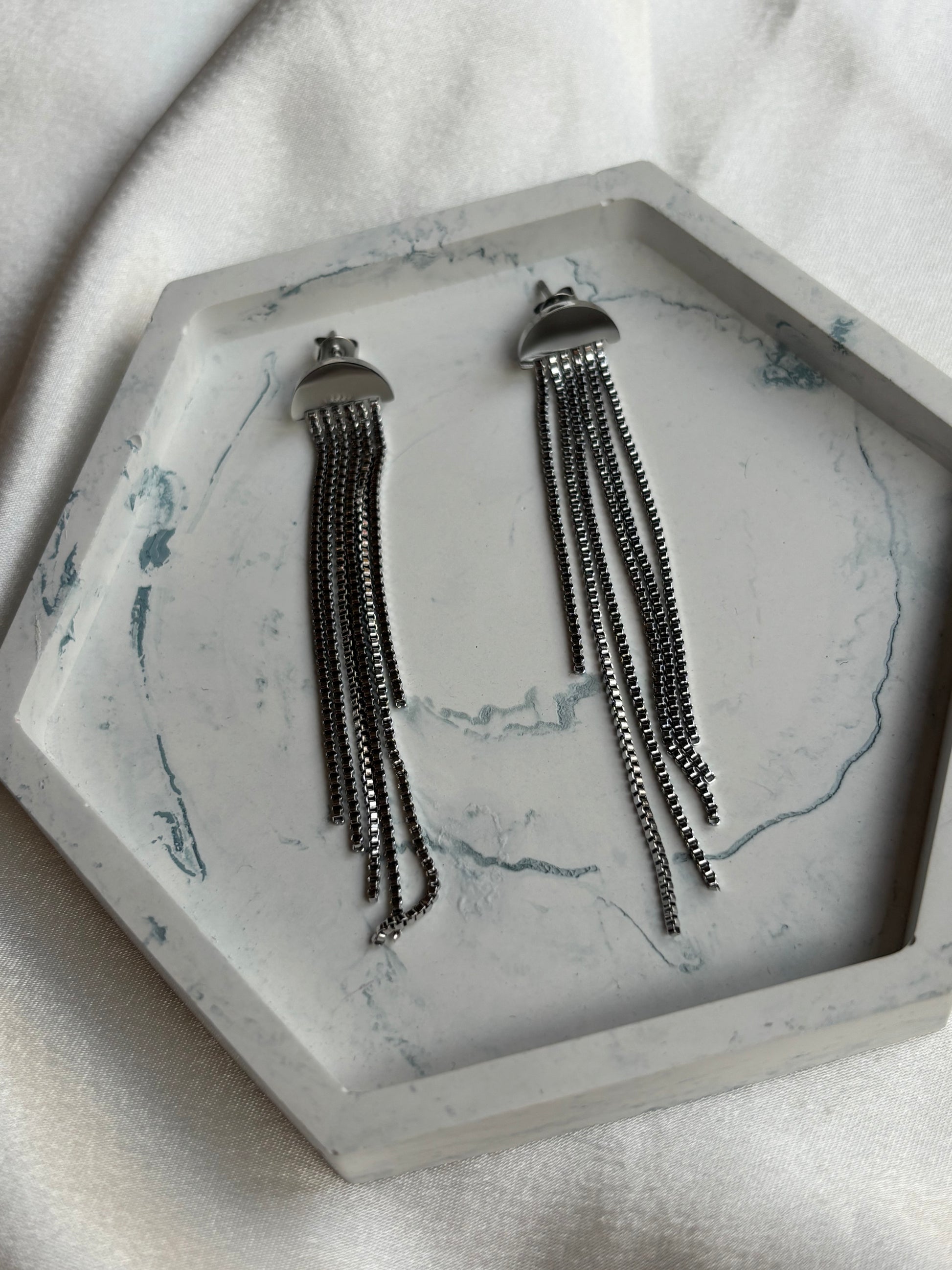 Ασημί μακριά σκουλαρίκια σε μίνιμαλ γραμμή για ξεχωριστές εμφανίσεις.