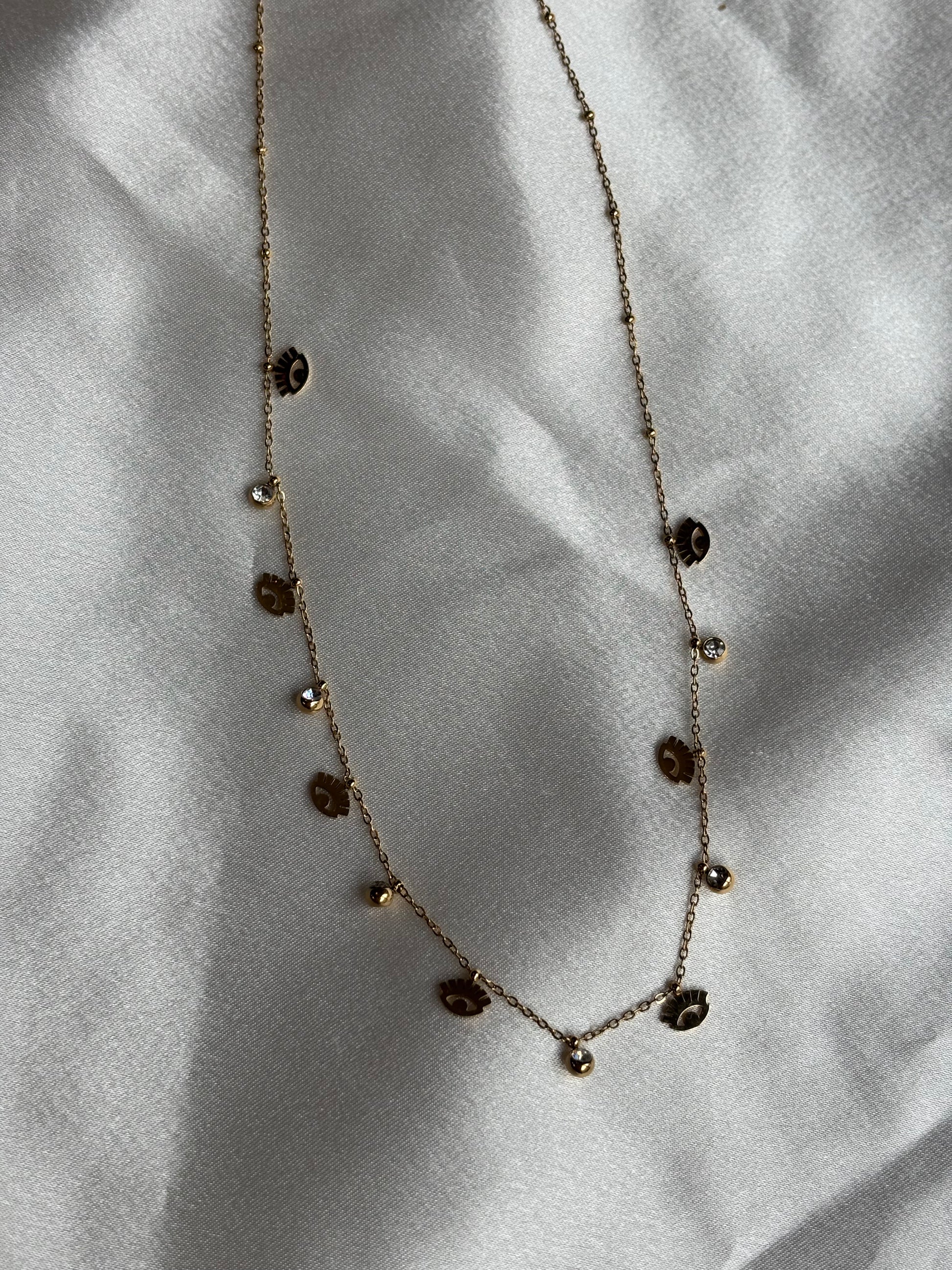 Κολιέ με ματάκια και ζιργκόν πάνω σε λεπτό αλυσιδάκι.