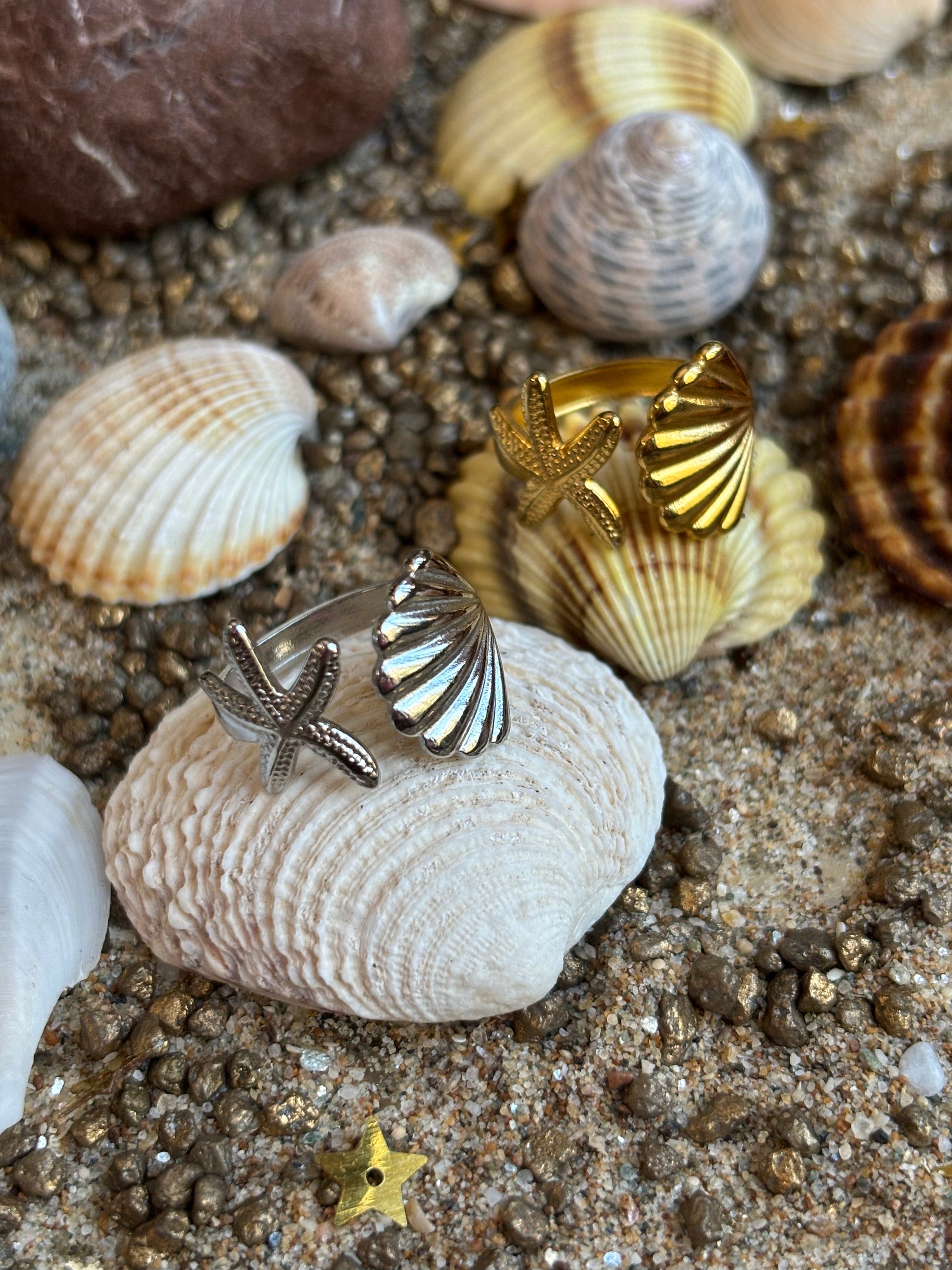 Ατσάλινα δαχτυλίδια σε ασημί και χρυσή απόχρωση, με σχέδιο κοχύλι και αστερία.