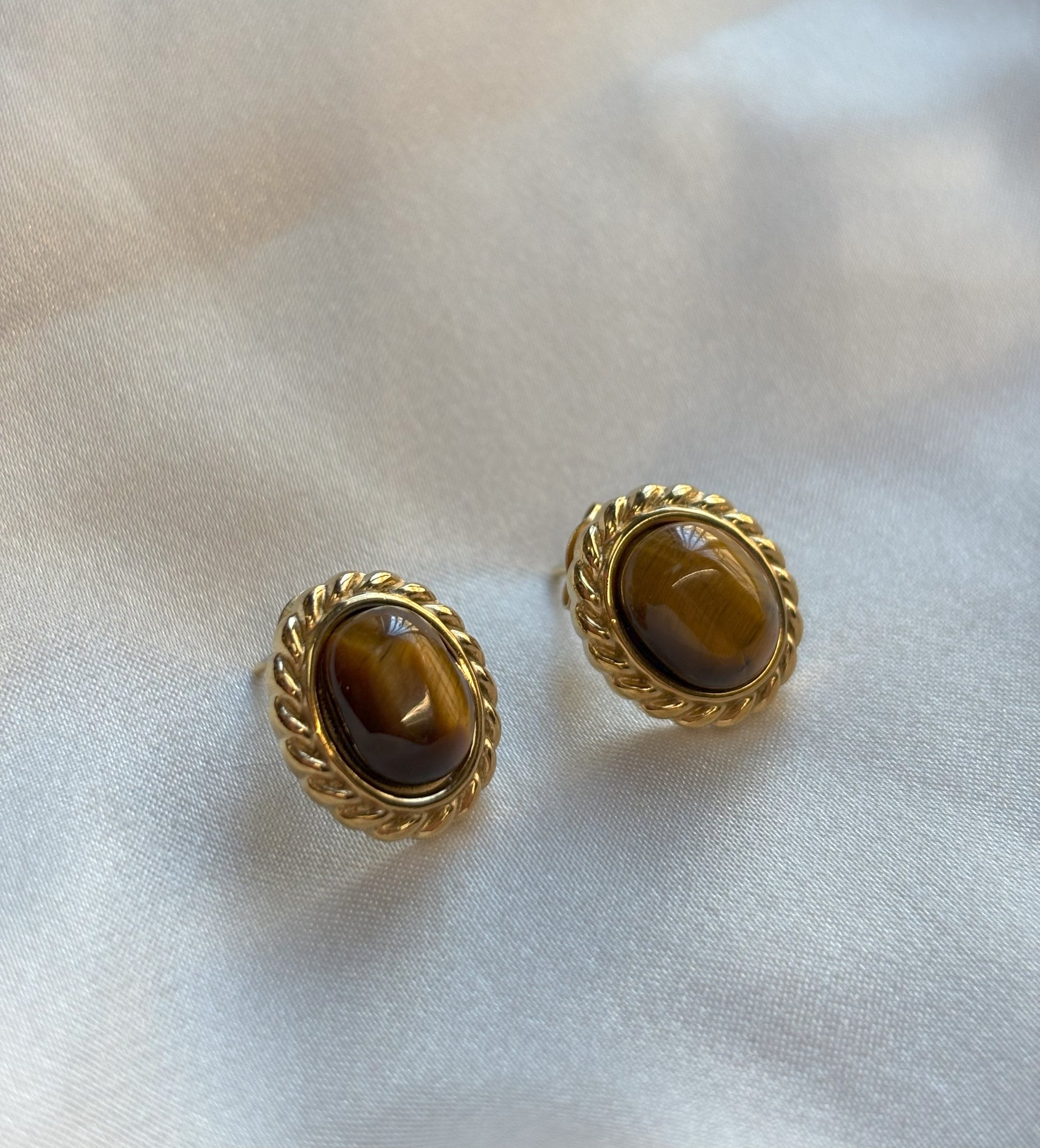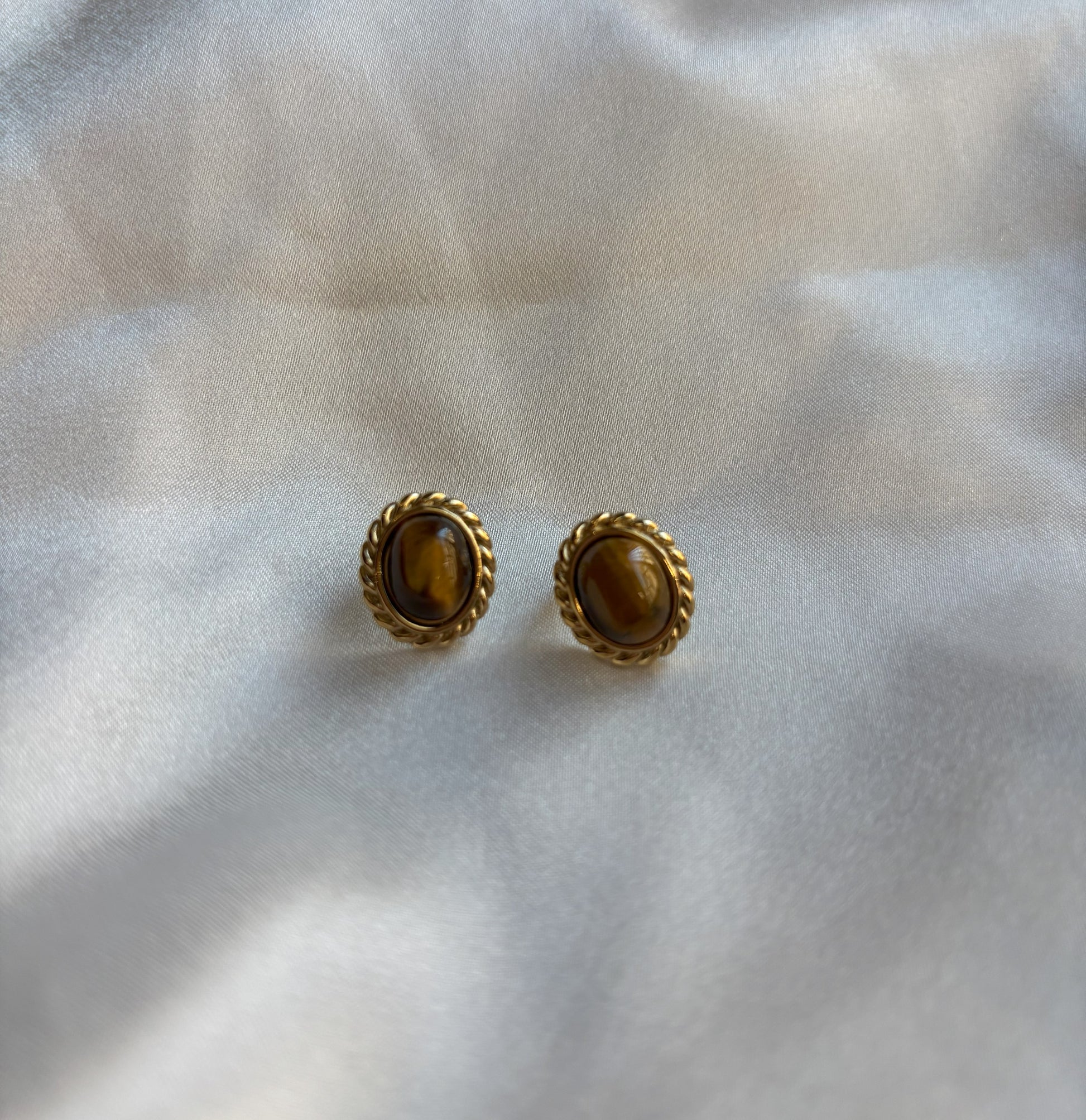 Καρφωτά σκουλαρίκια με καφέ πέτρα και χρυσή απόχρωση περιμετρικά.