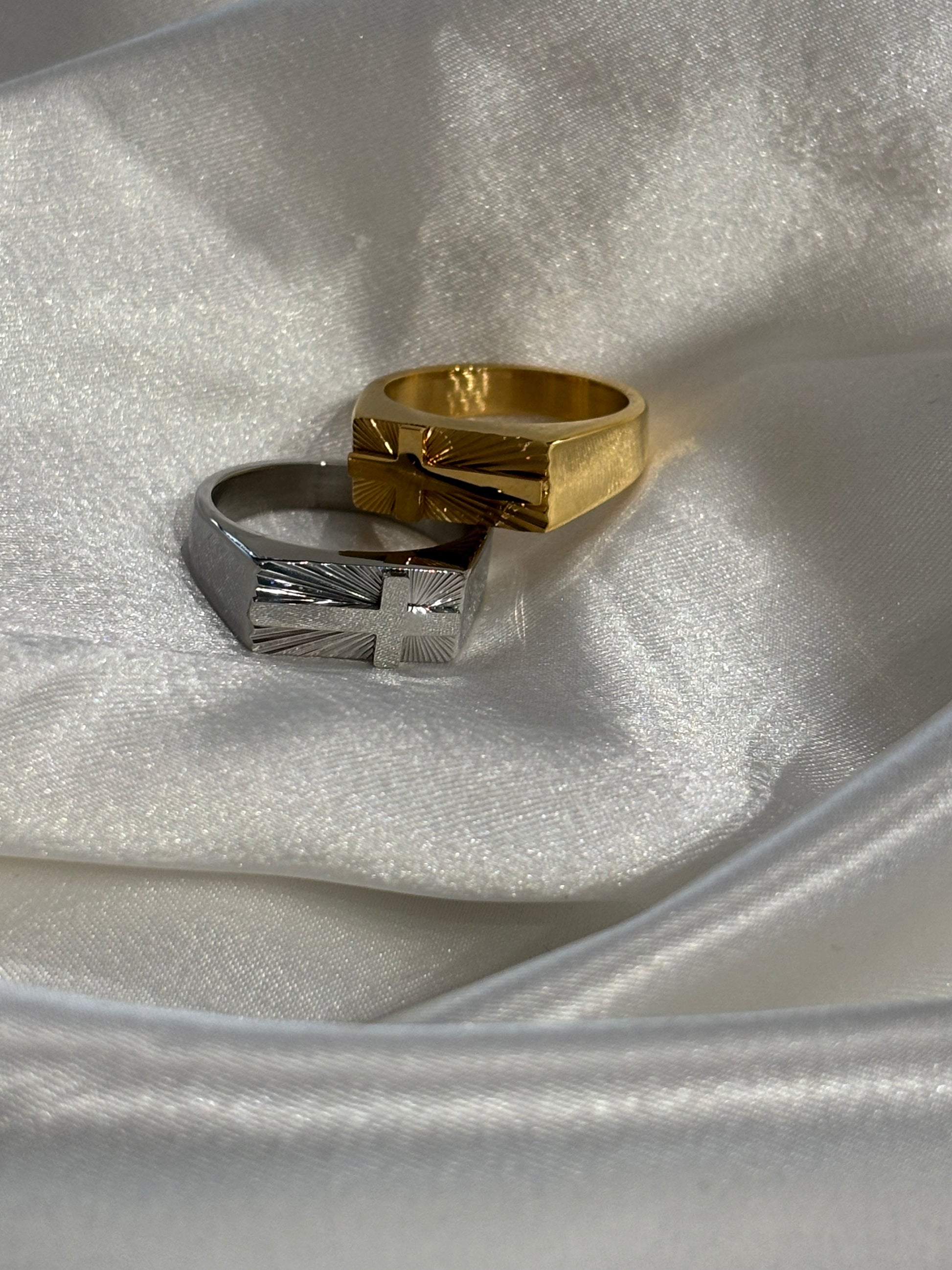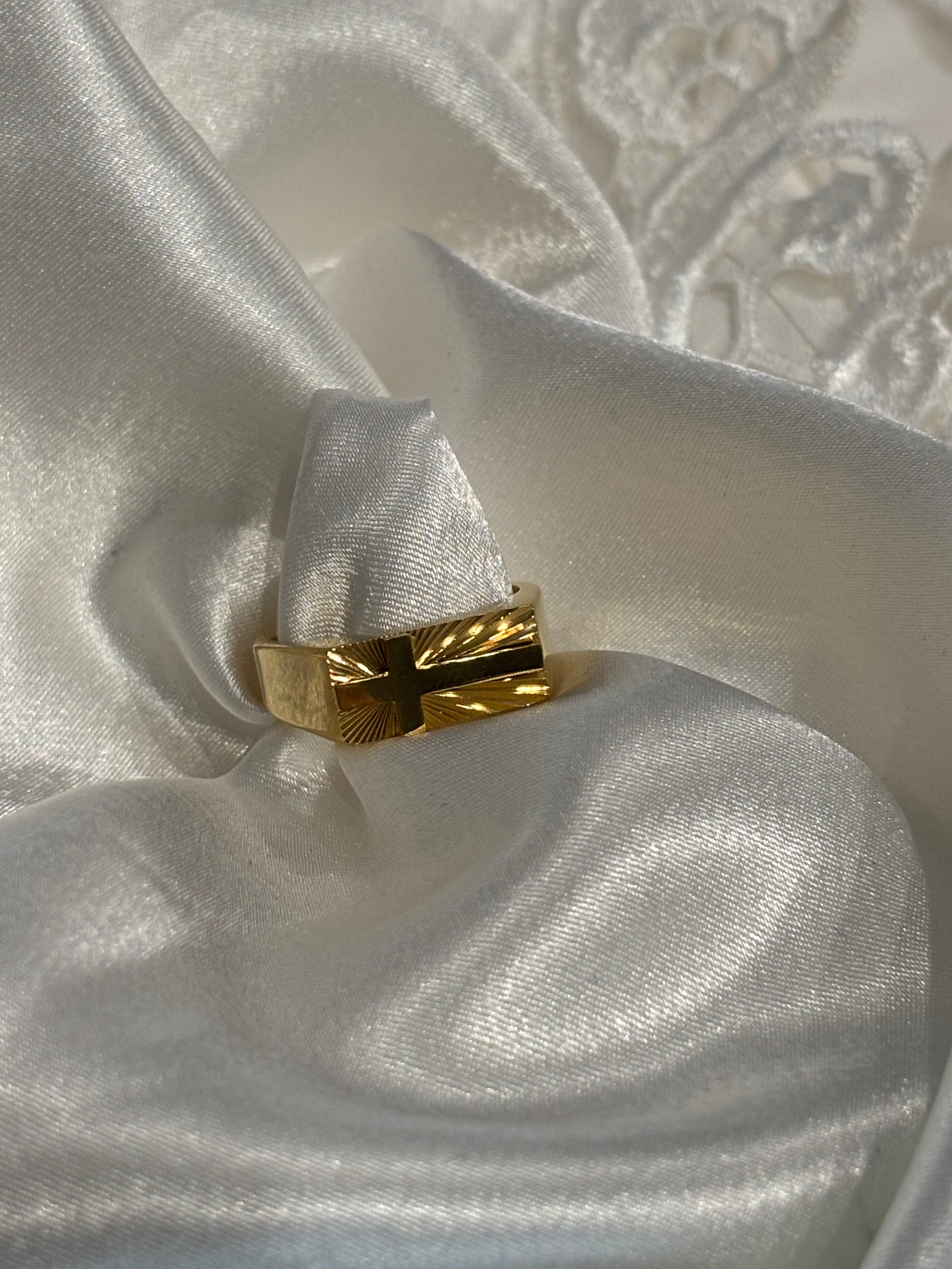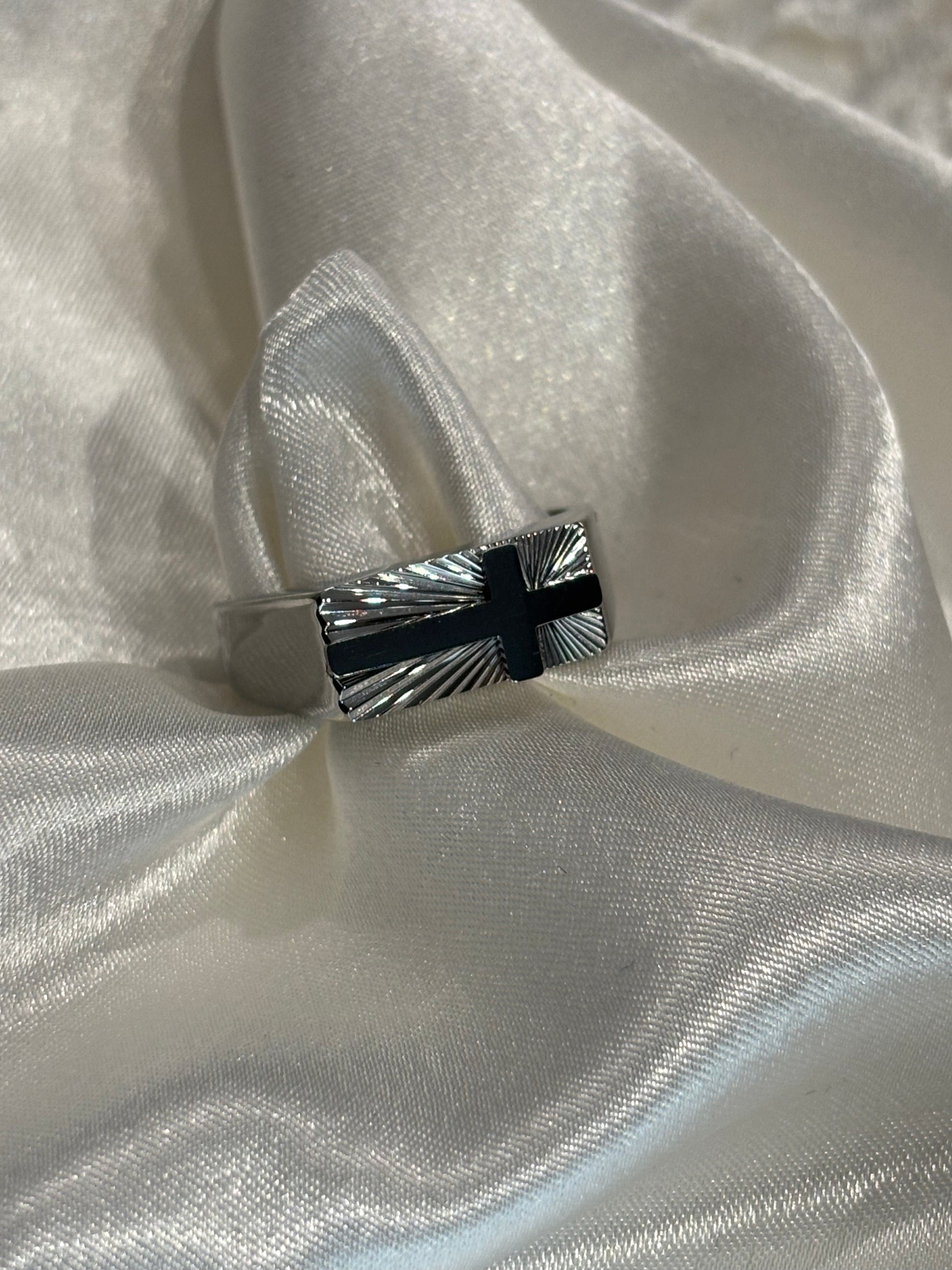Ανδρικό δαχτυλίδι σε minimal γραμμή με σταυρό σε απλή γραμμή στο πάνω μέρος.