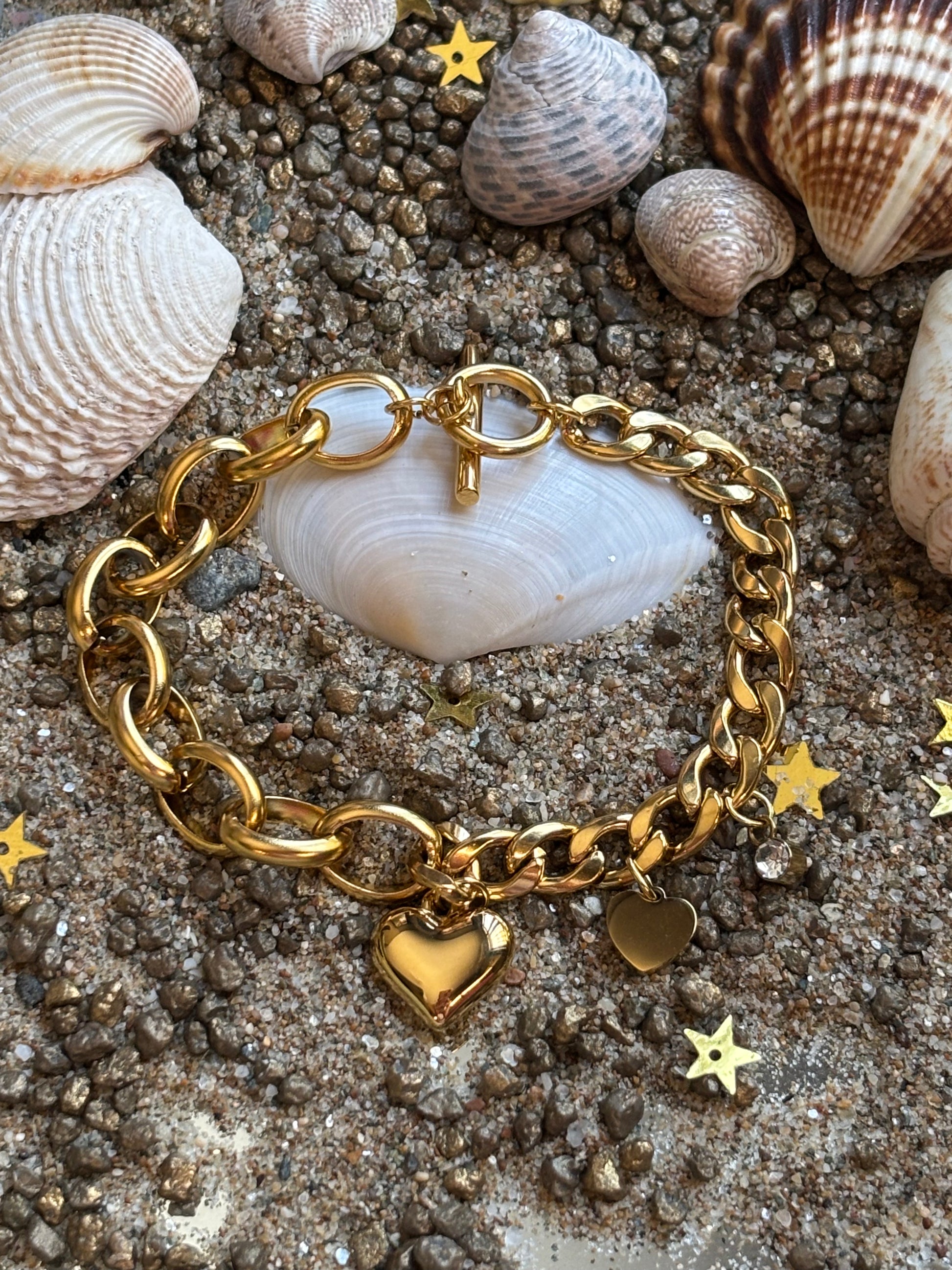 Χρυσό βραχιόλι με χοντρή αλυσίδα και διακοσμητικά στοιχεία καρδούλες.