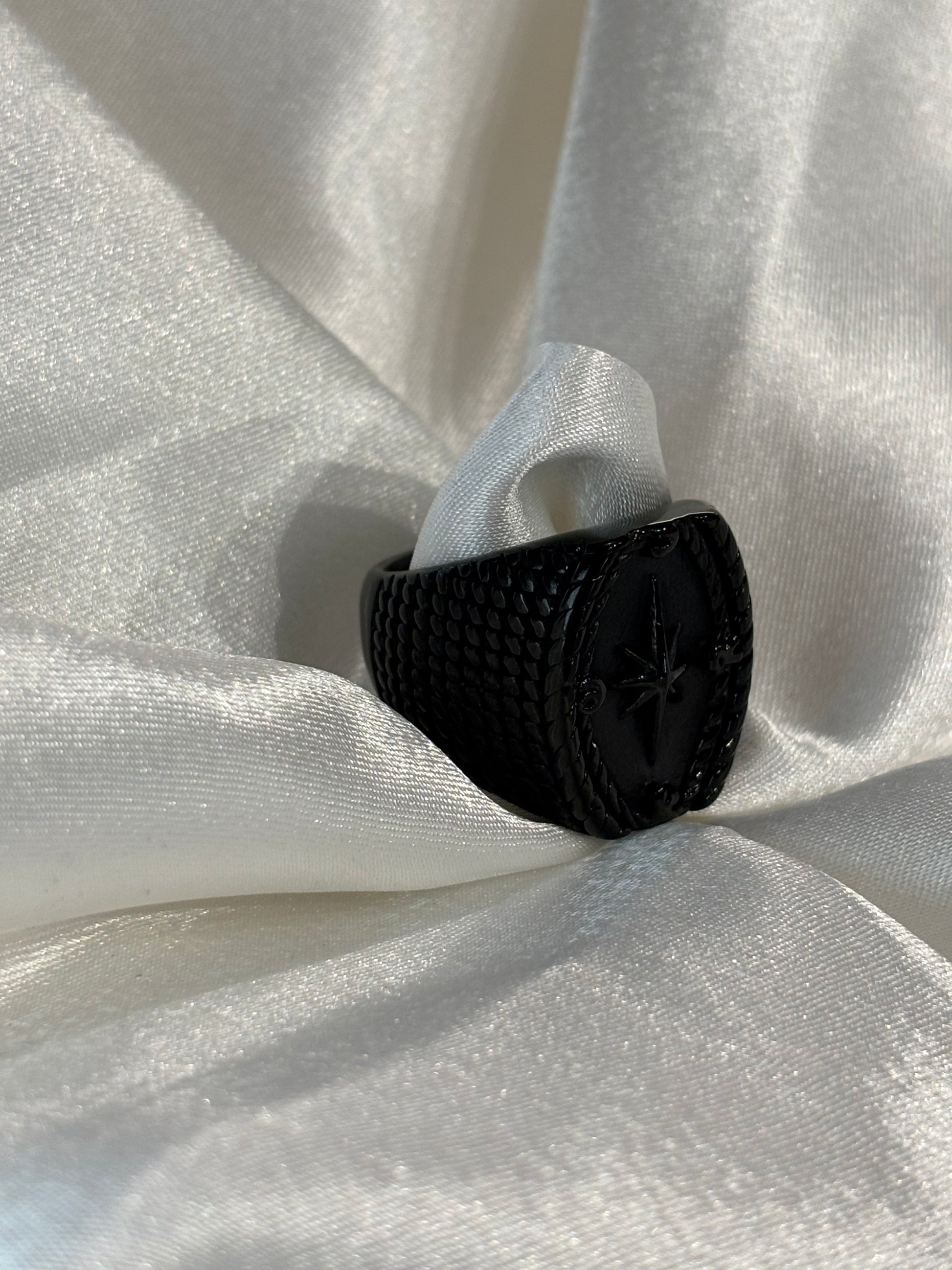 Ανδρικό δαχτυλίδι σε μαύρη απόχρωση με ανάγλυφη υφή και κεντρικό στοιχείο σημείο του ορίζοντα.