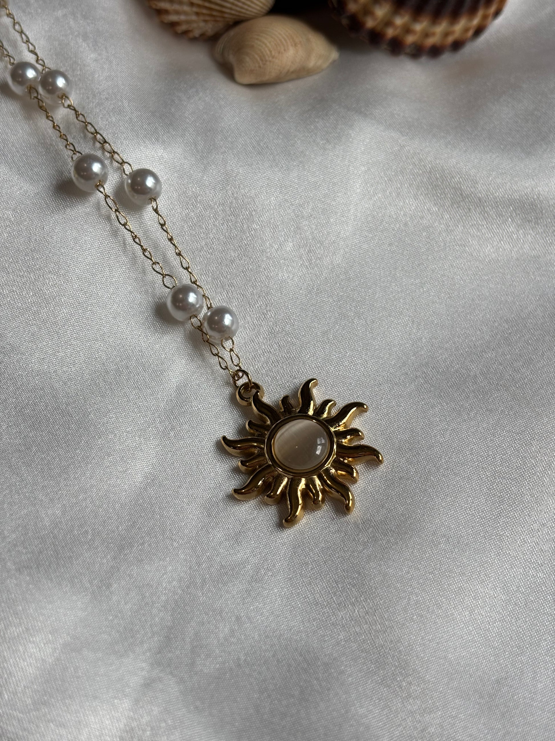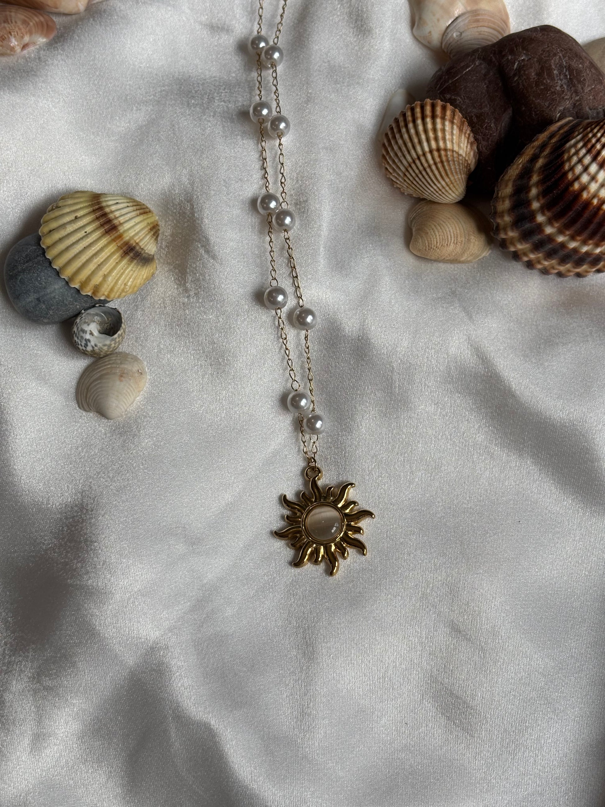 Ιδιαίτερο κολιέ με λεπτή αλυσίδα και μικρές πέρλες και διακοσμητικό στοιχείο έναν χρυσό ήλιο.