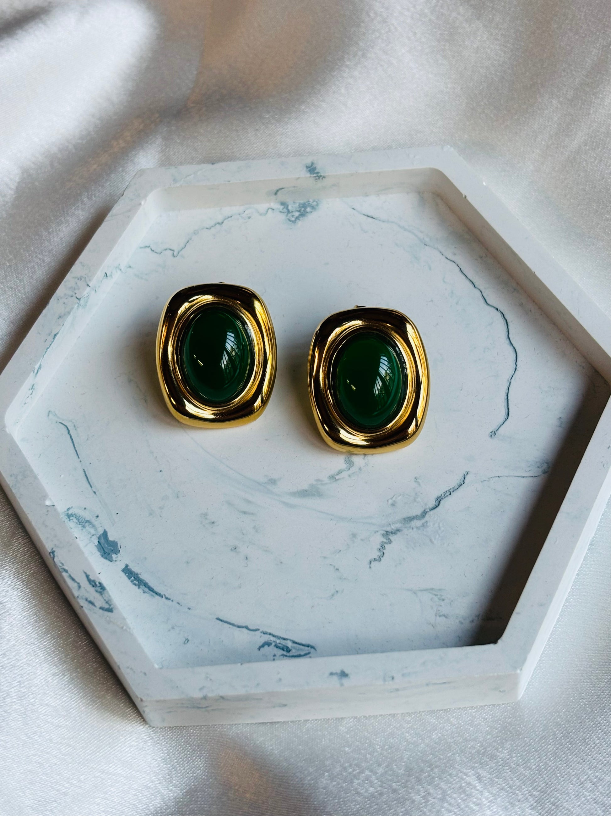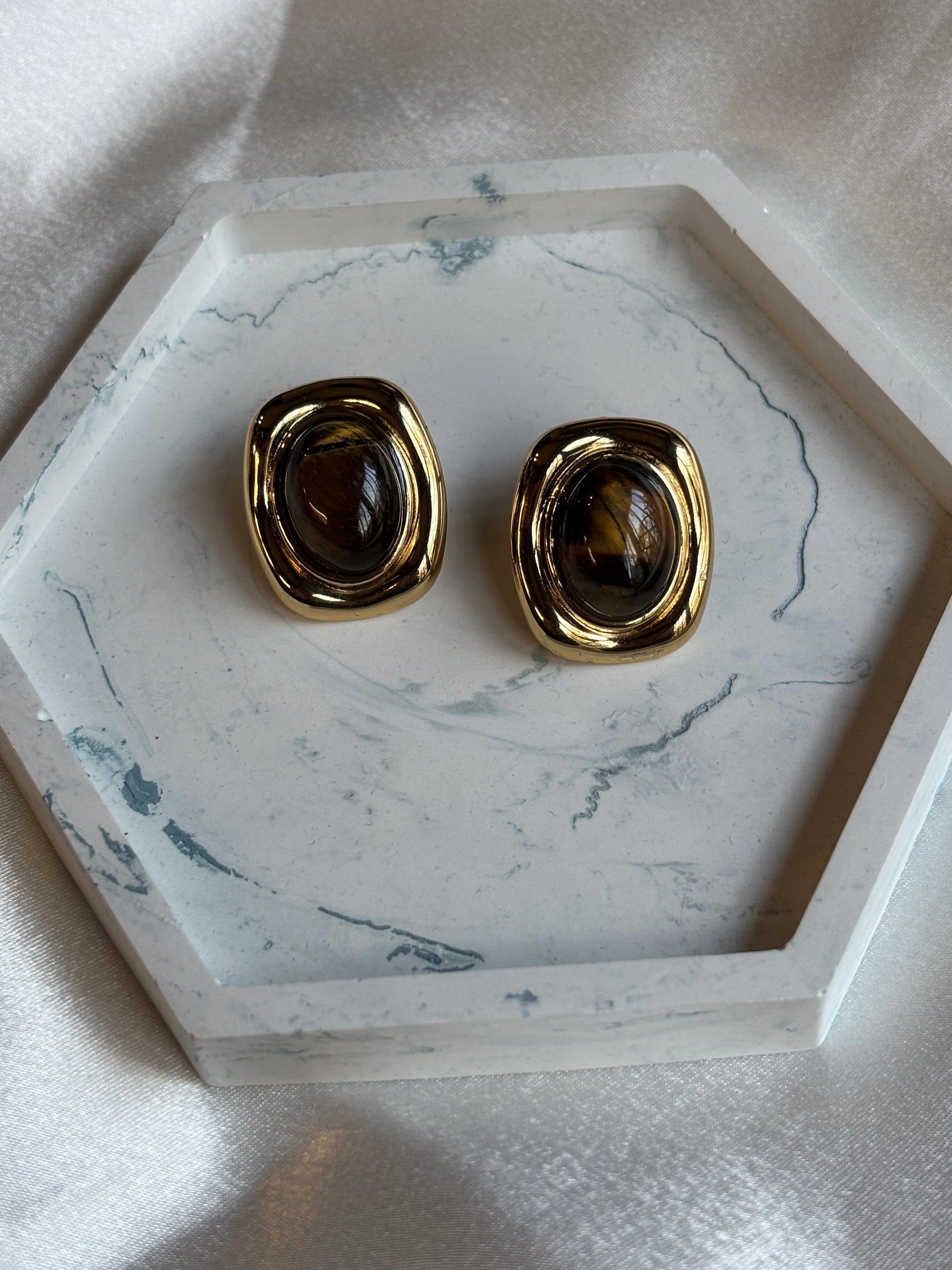 Εντυπωσιακά σκουλαρίκια με χρυσό περίγραμμα. Διαθέσιμο σε δύο αποχρώσεις, πράσινο και καφέ. Ιδανικά για όλες τις εποχές. Συνδυασμένο με τα πλεκτά σου, τα ανοιξιάτικα σετάκια σου αλλά και τα αέρινα καλοκαιρινά σου φορέματα.