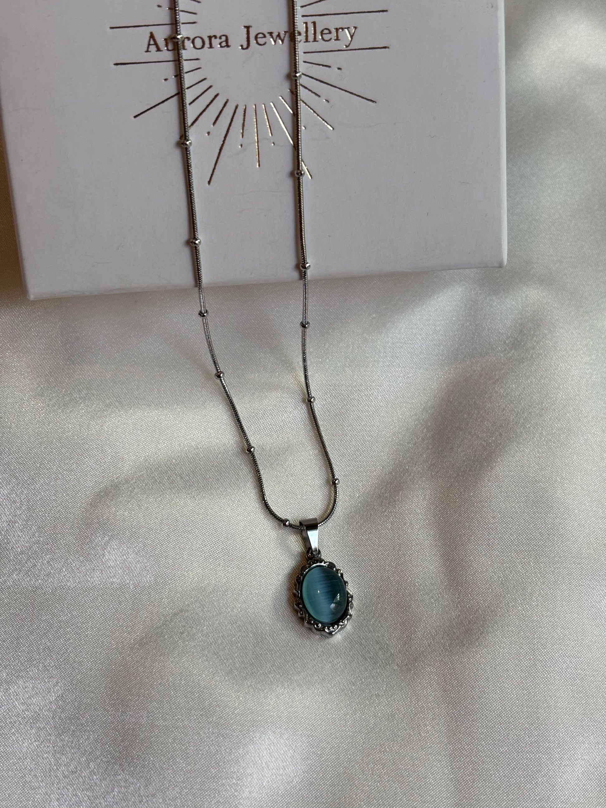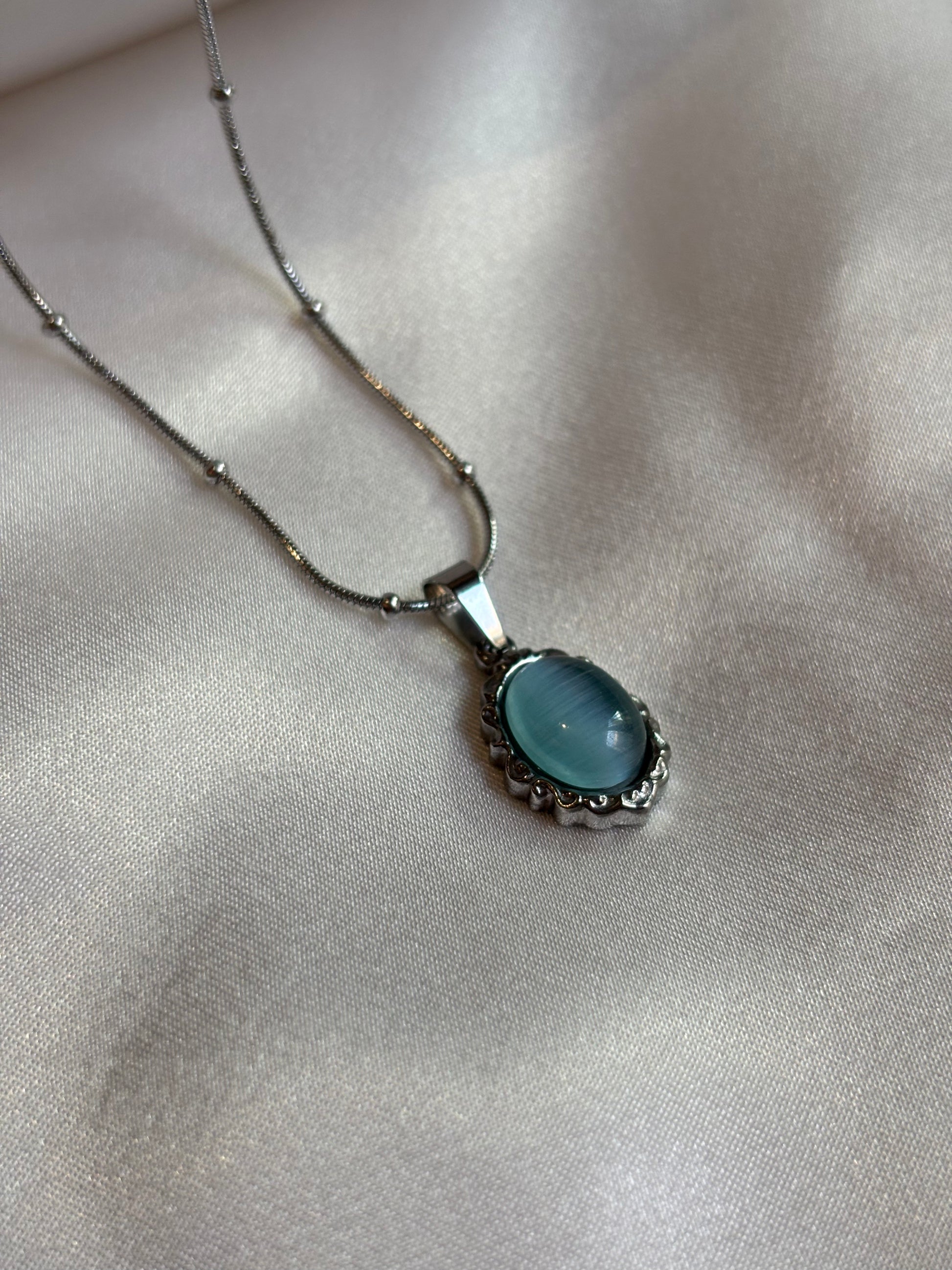 Κολιέ με ασημί αλυσίδα και διακοσμητικό οβάλ στοιχείο σε σιέλ απόχρωση.