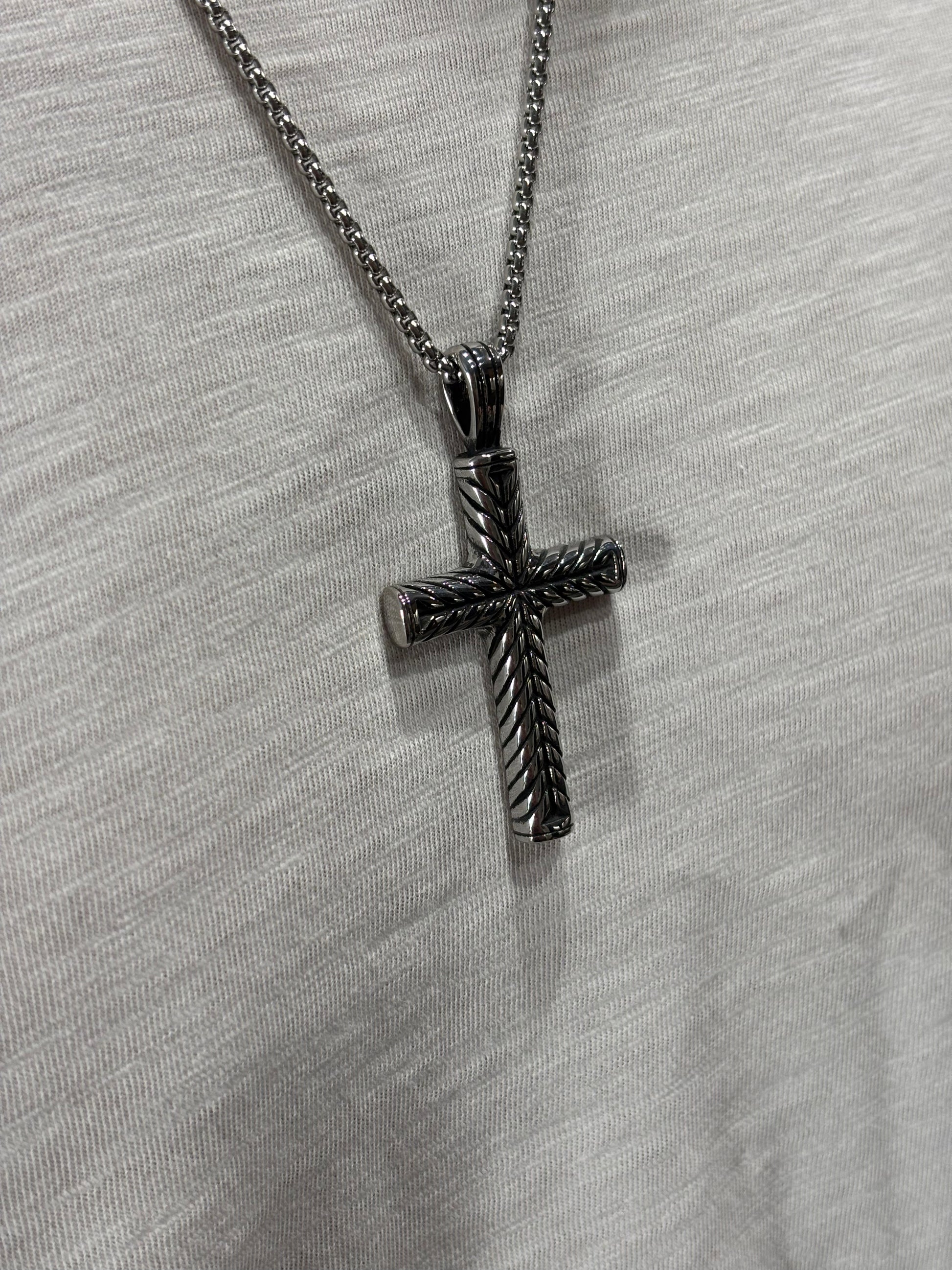 Σταυρός με αυλακώσεις σε ασημί απόχρωση.