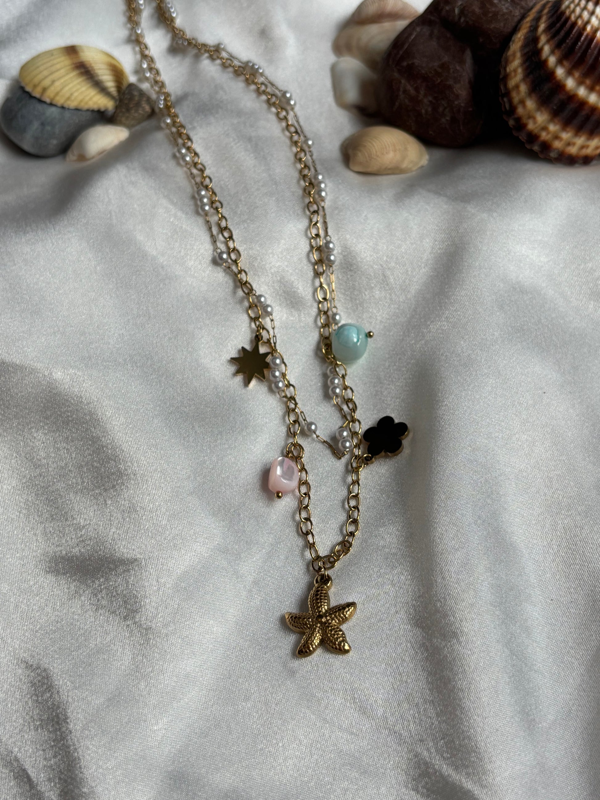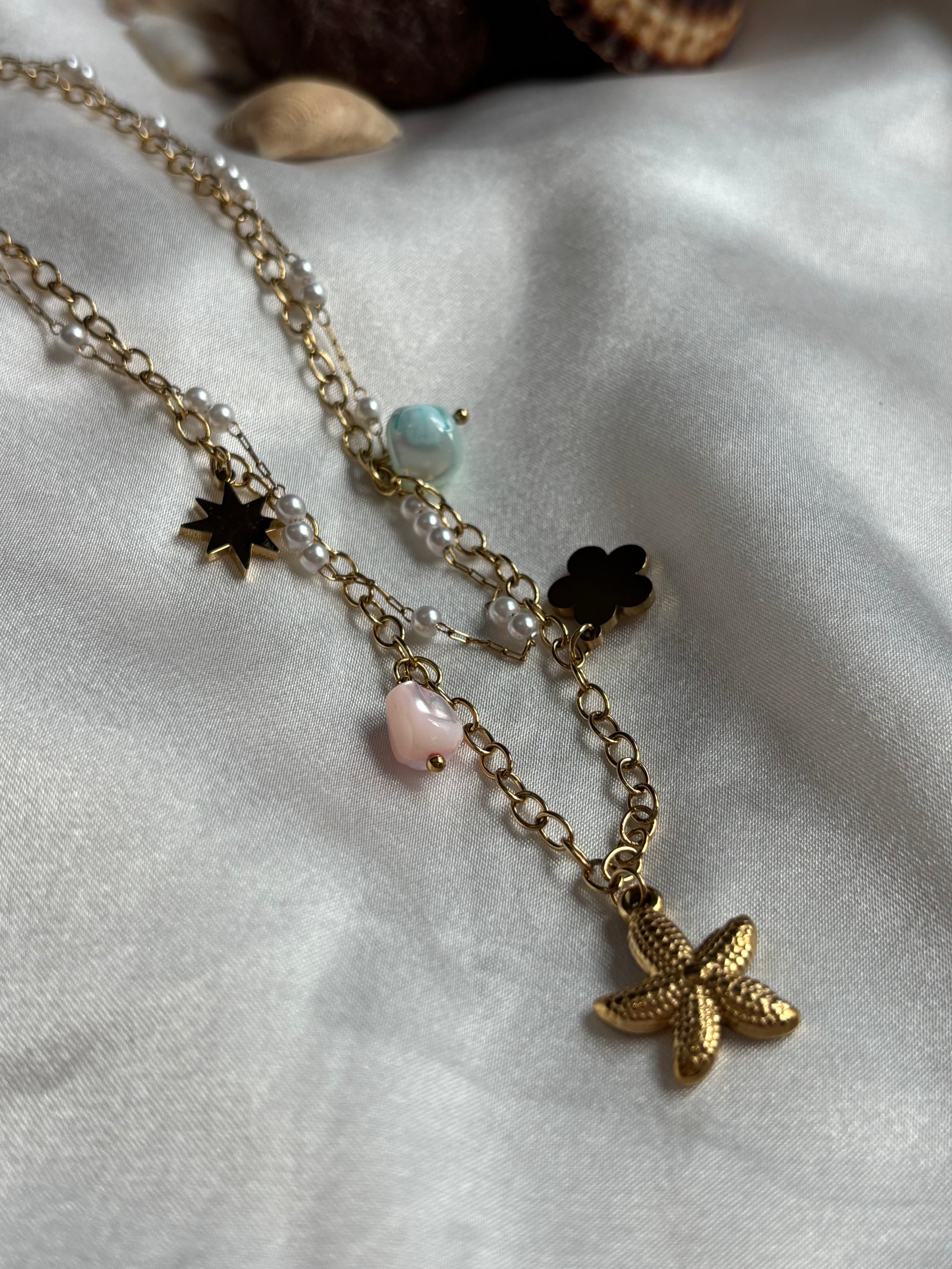Κολιέ με διπλή αλυσίδα, μία διακοσμημένη με διάφορα στοιχεία και μία πιο λεπτή με μικρές περλίτσες.