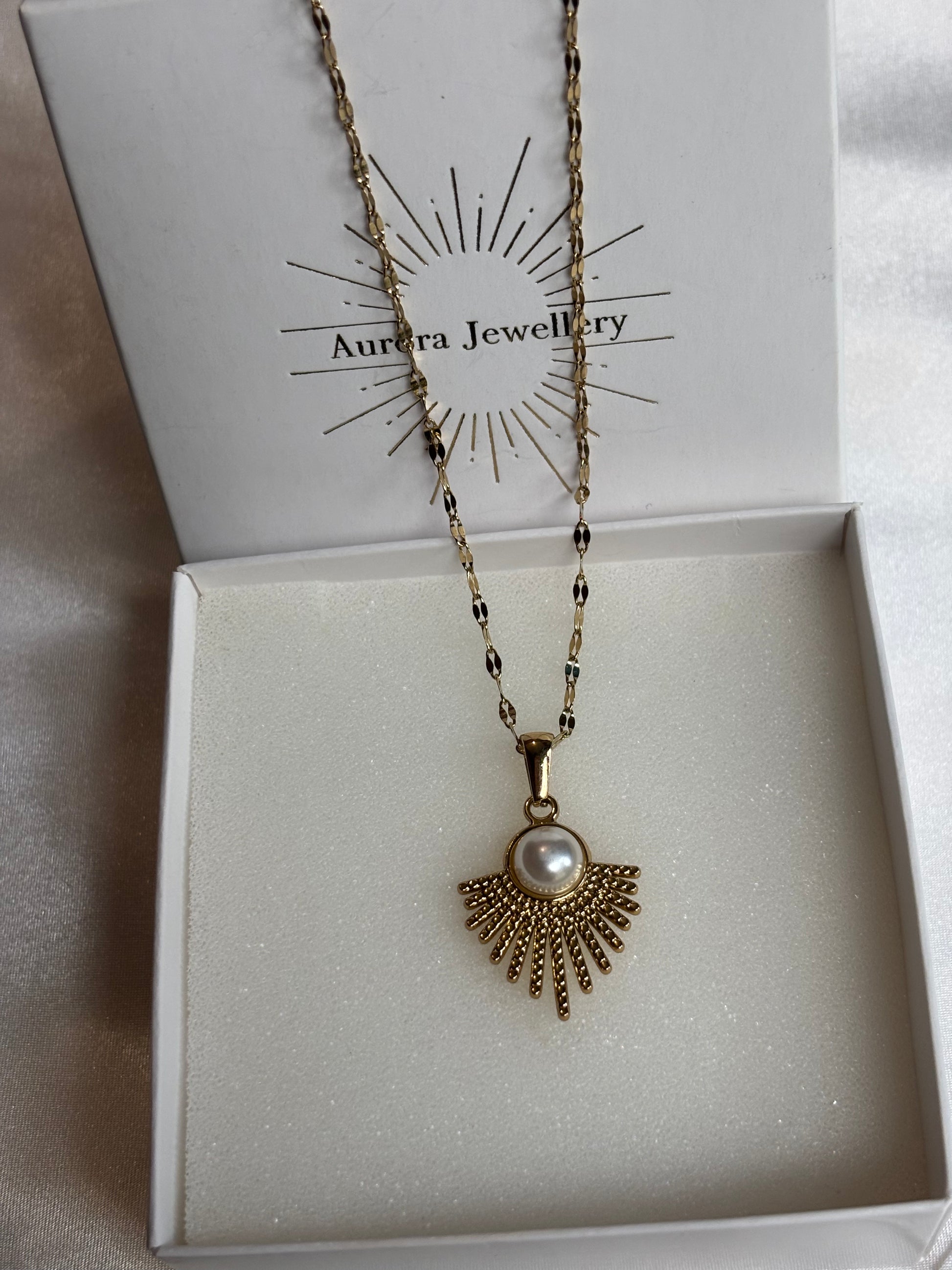 Αλυσίδα με διακοσμητικό στοιχείο με κεντρική πέρλα και στο κάτω μέρος σαν ακτίνες ήλιου.