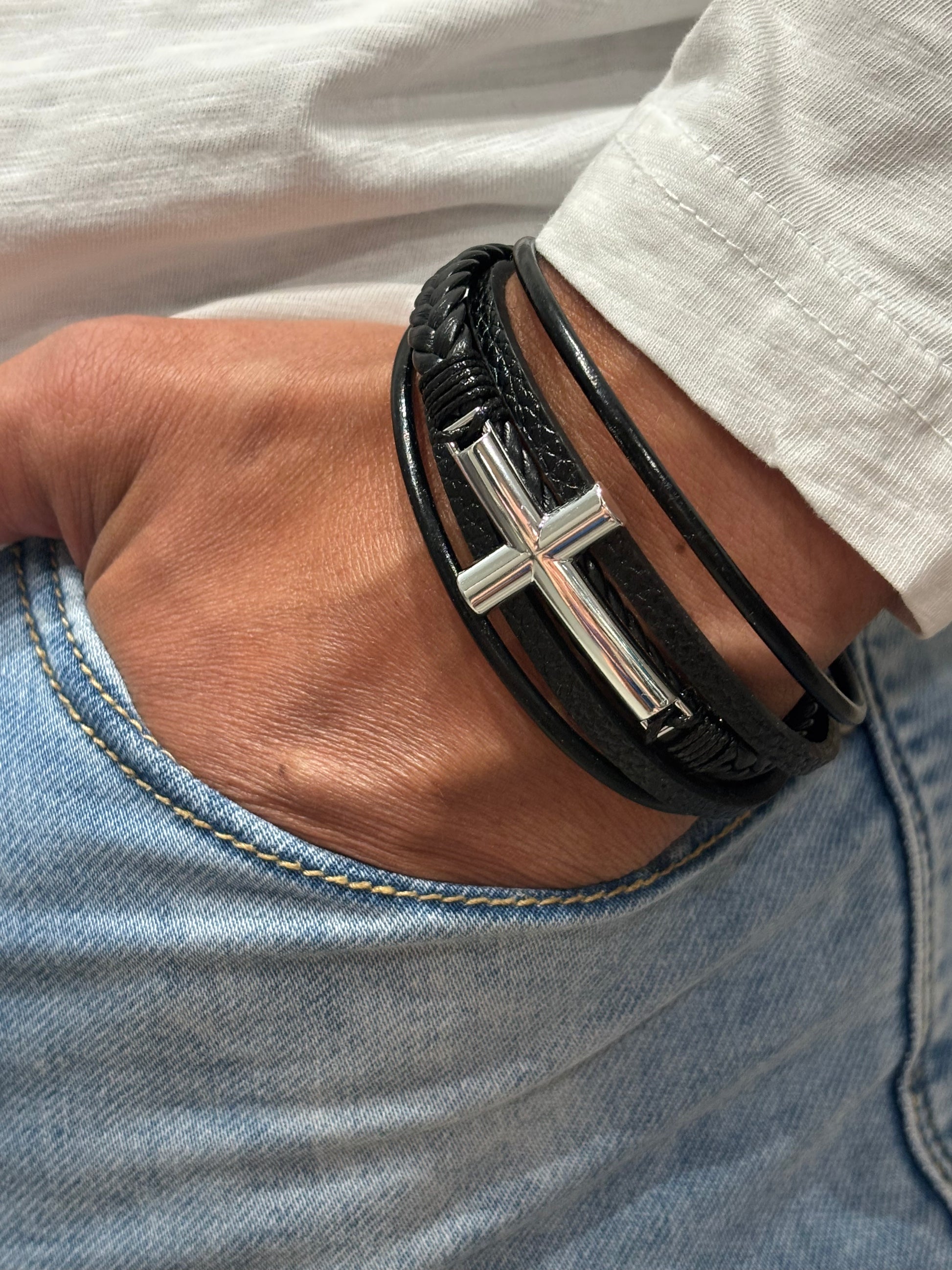 Ανδρικό βραχιόλι με λουράκια και σταυρό από ατσάλι ως διακοσμητικό στοιχείο.