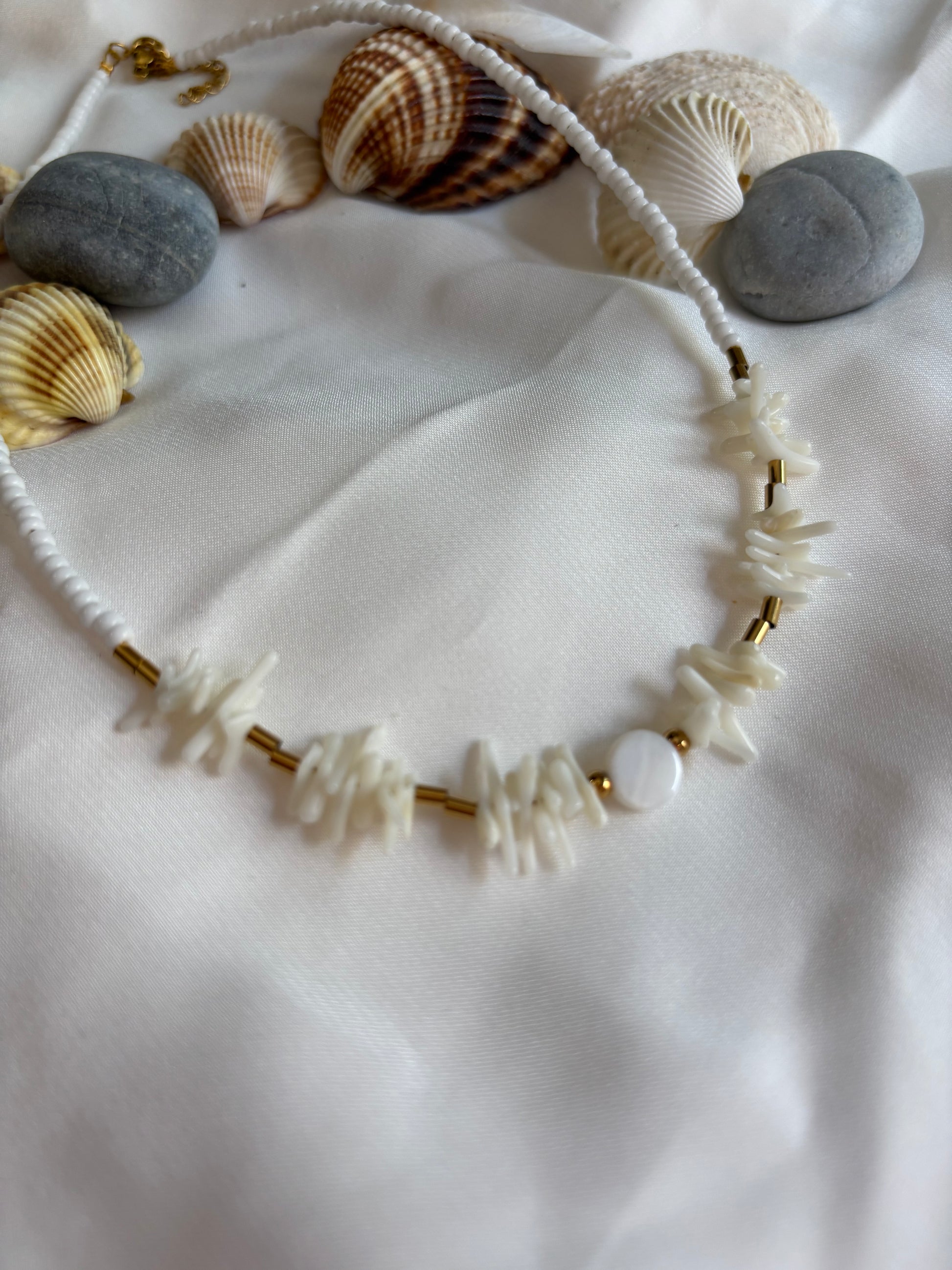 Κολιέ με λευκές πέτρες και διακριτικά χρυσά στοιχεία.