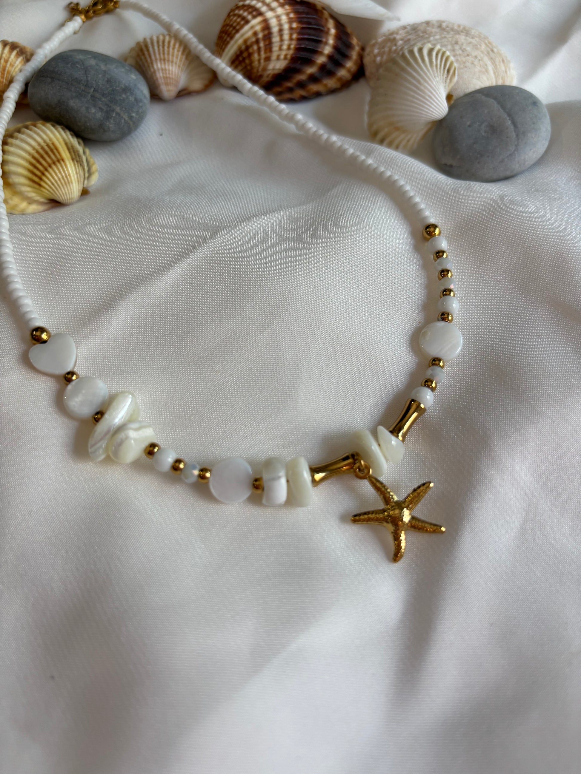 Κολιέ με λευκές πέτρες, χρυσά διακριτικά στοιχεία και διακοσμητικό αστερία.