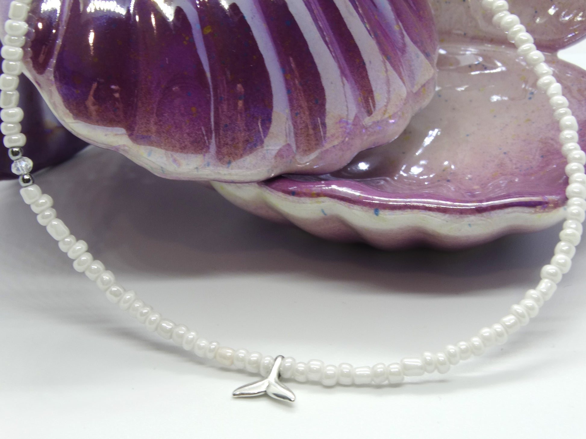Υλικό: κολιέ από γυάλινες χαντρούλες, ατσάλινο διακοσμητικό στοιχείο (ουρά γοργόνας), ατσάλινο κούμπωμα.
