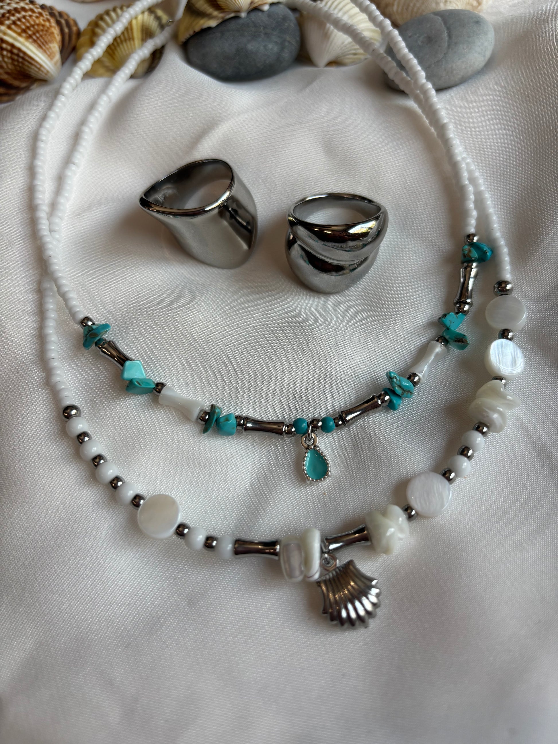 Ένα σετ αποτελούμενο από σούπερ καλοκαιρινά κολιέ με ατσάλινα στοιχεία και δύο δαχτυλίδια, που θα φοράς όλο το χρόνο.